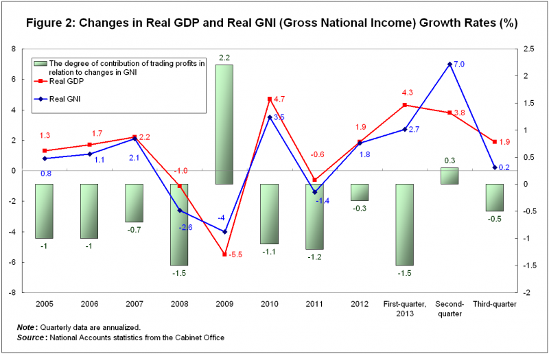 Third, the growth rate in import prices was higher than that of export prices. During the same period, export prices rose by 2.1%, while import prices increased by 10.4%. This is mainly because of a surge in energy prices. In short, it means that the terms of trade (the ratio of export prices and import prices) deteriorated.