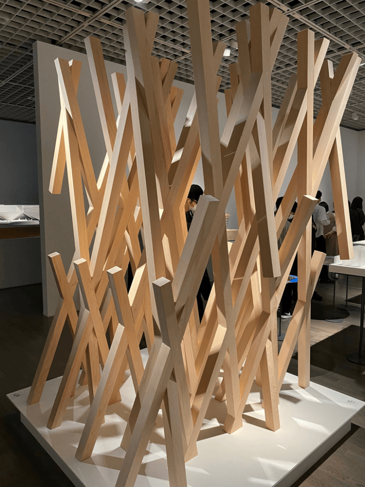 The “Five Purr-fect Points for a New Public Space” mentioned in this exhibition are “Hole,” “Particles,” “Softness,” “Oblique,” and “Time,” categorizing the public architecture realized by Kuma at the first venue according to these viewpoints and presenting them using models and images. Nagaoka City Hall Aore (2012, Niigata Province), where a covered square serves as a local community, and the V&A Dundee in Scotland (one of TIME magazine’s “World’s Greatest Places 2019—100 Destinations to experience right now”) (Fig. 2) are masterpieces that make you feel the power and potential of the “hole” to connect people and things. Alternatively, the National Stadium (Fig. 3), which applies traditional Japanese architectural techniques by using collections of small-diameter trees to make huge architecture, and Sunny Hills Japan (2013, Minato Ward, Tokyo), which created a forest-like space with thin wood inspired by the jigoku-gumi (interlocked beams) of Japanese carpentry (Fig. 4), seek to open up architecture to the outside by accumulating wooden boards and narrow wood as “particles.”