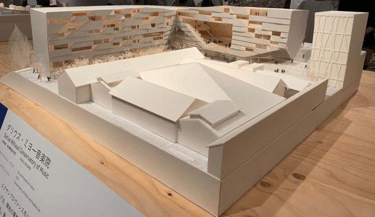 In a section that attempts to reexamine the relationship between the human body and architecture in terms of softness to hardness, we see how the Takanawa Gateway Station (Fig. 5), which uses a large membrane-structure roof and combines iron and laminated wood, has produced impressions of the warmth and softness of old wooden station buildings. Moreover, the oblique structures we see in Nezu Museum (2009, Minato Ward, Tokyo) and the Darius Milhaud Conservatory of Music (Fig. 6) are elements that figure frequently in Kuma architecture, aspiring to create effects of free tilting that is neither horizontal nor vertical. The last point is “time,” where we have the fifth-generation Ginza Kabukiza (2013, Chuo Ward, Tokyo) as an example of a building that preserves memories of the past while being reformed as a building, but what was meant by time in this exhibition is aging and crumbling with the passage of time in addition to past memories. It is said that the techniques for making things weak or yield are analogous to those for making things smaller (crushing into particles), softening them, and making them tilt.