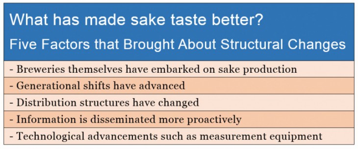 The recent popularity of sake did not just happen to coincide when better tasting varieties started to appear. The surge in popularity arises from significant structural changes that happened behind the scenes. Sake from new brewers has changed drinking scenarios and the demographics of drinkers themselves.