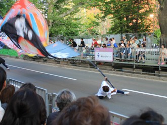 I am reminded again how happy and invigorating it is to express something by moving your body. When we encounter a person that moves dynamically, we unconsciously stop to watch. In the same way, our eyes were glued to the parades — led by jikatasha vehicles, or trucks decorated and equipped with sound equipment — as teams danced in groups all day on Odori Avenue. Before I knew it, I found myself spontaneously shouting “hang in there” to groups in the parade who looked physically tired from dancing at many places, but still exhibited a sense of excitement. I then wondered what it was that attracted people to this dazzling scene of bodily expression. Was it the parade? The stage?
