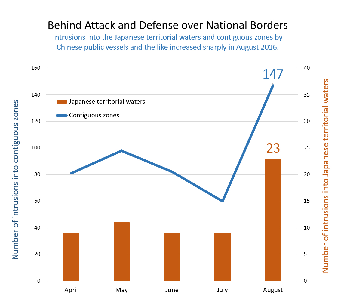 Note: The left and right axes show the number of intrusions into contiguous zones and the number of intrusions into Japanese territorial waters, respectively. (Figures presented below are the numbers in 2016).