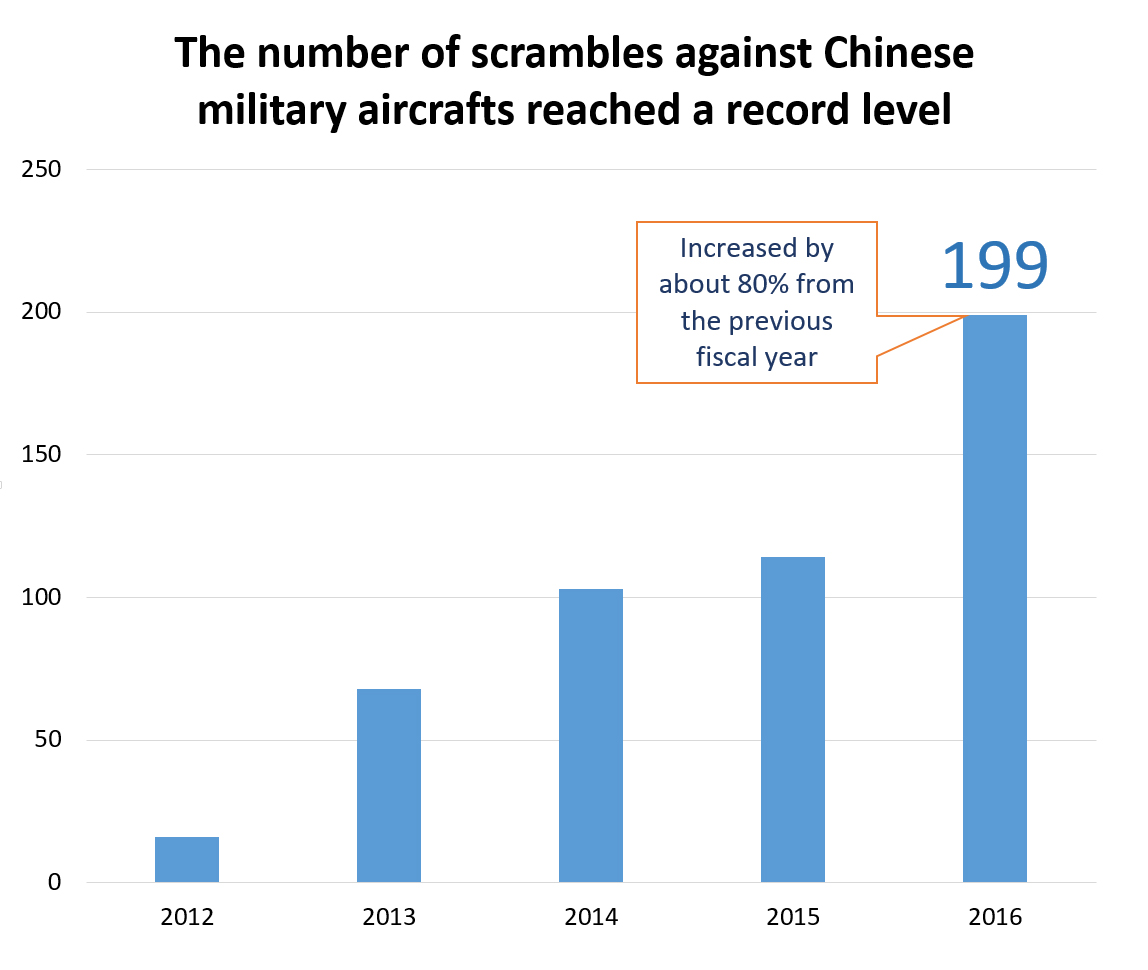 Japan has bolstered the defense of the Southwest Islands by the Ground Self-Defense Force, the Maritime Self-Defense Force, and the Air Self-Defense Force based on its Dynamic Joint Defense Force concept in order to cope with China’s defiance in the East China Sea. Japan has also stepped up the deterrence of the Japan-U.S. alliance through the enactment of peace and security acts and the revision of the Japan-U.S. defense cooperation guidelines. In spite of these steps, a Chinese war ship navigated the zone contiguous to the Senkaku Islands for the first time in June 2016. The Air Self-Defense Force measures taken against intrusions into Japanese airspace totaled 199 in the period from April to June 2016, a sharp increase from the same period in the previous fiscal year,