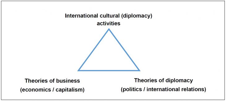External cultural communication or international cultural exchange are closely related to theories of capital and theories of diplomacy. So, what is the balance in this triangular relationship? I use the fixed-point observation model below to think about this issue.