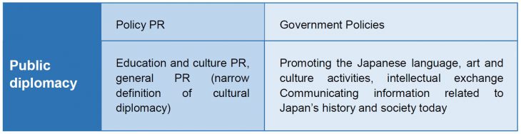 In which case, where within diplomatic activities should we place international cultural exchange and cultural activities? In the case of Japan, the PR activities conducted on the ground in diplomacy are conceptually separated into two types: policy PR and education and culture PR / general PR.