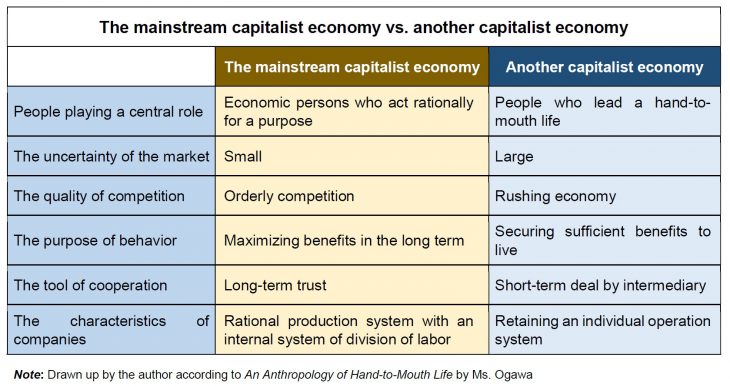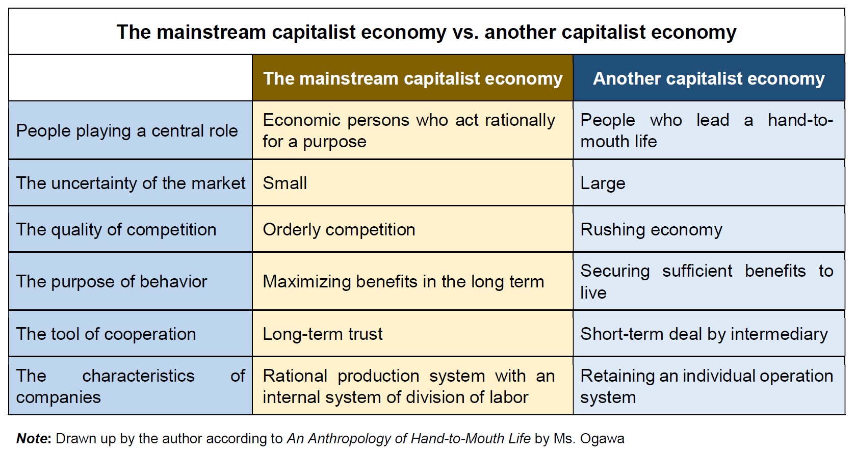 It is not limited solely to China researchers who argue against the view that the capitalist economy will converge to the universal Western model in Japan. In An Anthropology of Hand-to-Mouth Life, Ogawa Sayaka, Associate Professor of Anthropology at Ritsumeikan University, notes that urban people who lead a hand-to-mouth life are a third type, who are neither economic persons who act rationally for a purpose as an ideal type supporting modern capitalist society nor premodern persons shackled by traditions and customs living in farming villages left behind by modernization, and describes “another capitalist economy” created by those people. (Refer to the chart below.)
