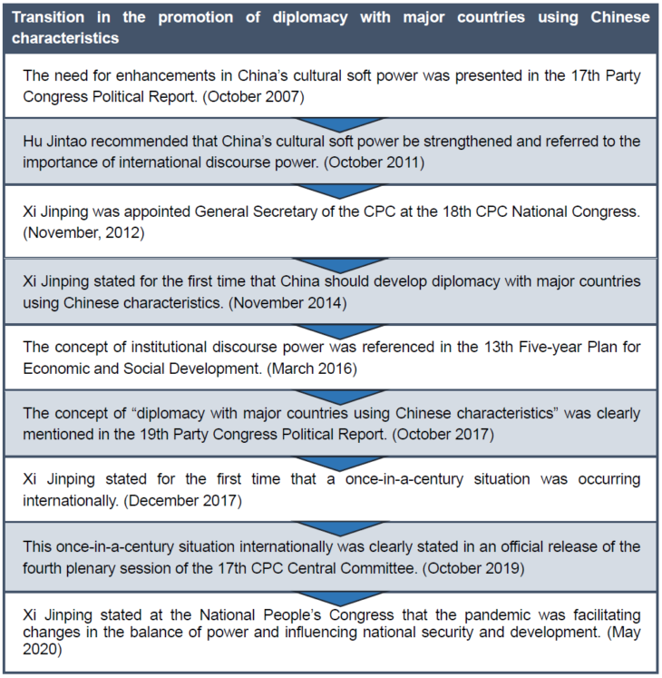 The current leadership has been emphasizing institutional discourse power, which is influential power generated by logic and values in a speaker’s words, explanations and power that makes the listener accept what the speaker says. It may be defined as power that makes the listener have empathy and respect for the speaker’s words. Institutional discourse is power that makes China’s requests accepted for creating agendas and voting in international systems that constitute the world order.