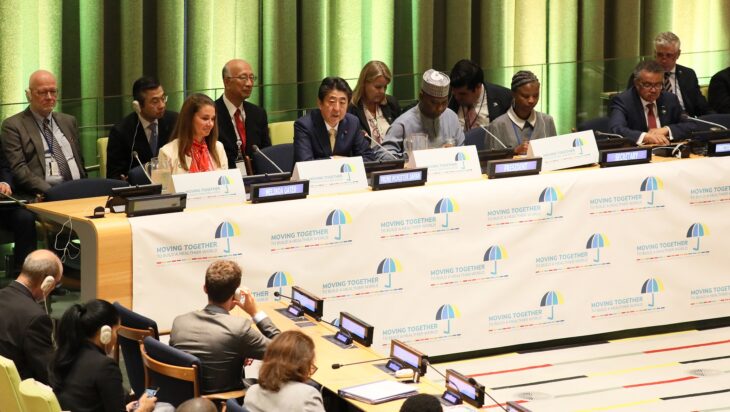 On September 23, 2019, then Prime Minister Abe Shinzo (front row, second from left) addressed the closing session of the UN High-Level Meeting on UHC. Bessho Koro (back row, third from left), then Ambassador Permanent Representative of Japan to the United Nations, is sitting behind Abe. H.E. Tijjani Muhammad Bande, President of the 74th Session of the United Nations General Assembly (front row third from right), Director General Tedros of the WHO (front row right hand side), Ms. Melinda Gates (front row left hand side) also participated in the session.