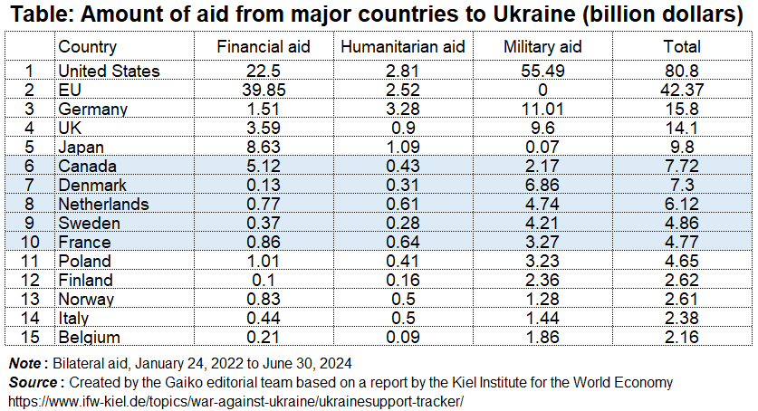 As of June 2024, the international community has donated a total of $210.8 billion to Ukraine, led by the United States with $80 billion (military, humanitarian, and financial aid). Japan has donated $9 billion, making it the fifth largest donor after the United States, the European Union (EU), Germany, and the United Kingdom. The EU and Japan specialize in financial and humanitarian aid (see table).