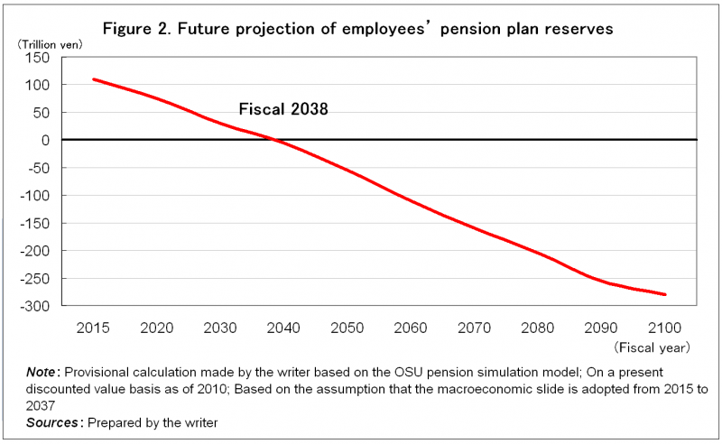 If so, what will happen to the real pension finance? Although the economic situation has improved due to the effects of Abenomics, the general picture remains very severe. Based on the future projection made using the OSU model, the most popular pension simulation model in Japan, employees’ pension plan reserves will apparently become depleted in fiscal 2038 (Figure 2). National pension reserves are also likely to become depleted by 2040.