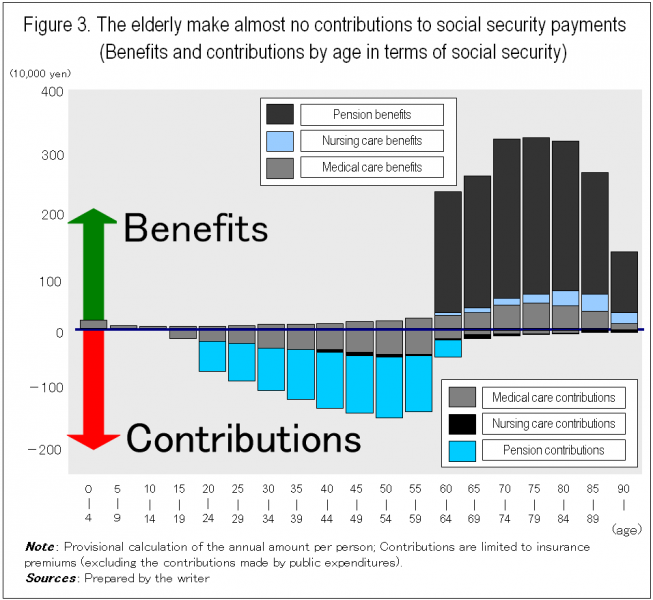 As it is known that approximately 60% of Japan’s household financial assets, with a value of approximately 1,400 trillion yen, are held by the elderly, most elderly at the present time are not socially vulnerable, in contrast to the image they had in the past. There is therefore plenty of room with regard to well-off elderly people who possess substantial assets to adopt measures of (i) reducing the large amount of public spending and raising contributions and premiums, (ii) reducing pensions or strengthening the taxing of pensions, and (iii) collecting expenses from the inheritance of assets.