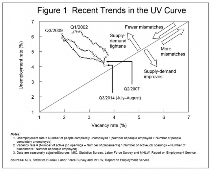 Next, I will discuss the decline in unemployment rate in greater detail. In general, there are two categories of unemployment: deficient demand unemployment and structural unemployment (due to a mismatch between the labor supply and demand). An analytical method, called “Unemployment-Vacancy (UV) analysis,” has been developed to break the unemployment rate down into the two different categories mentioned above. Figure 1 shows the recent trends in the “UV curve” as illustrated by Professor Murata Keiko of Tokyo Metropolitan University.