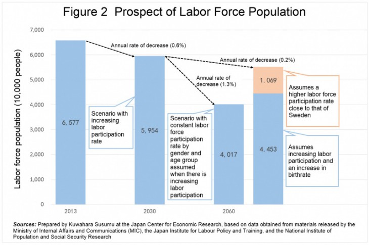 Let us take a look at the estimation made by Kuwahara Susumu, the principal economist at the Japan Center for Economic Research. Kuwahara estimated the labor force participation rate in 2030 and 2060 based on the data for 2013 (Figure 2). The estimation shows that despite a certain increase in the labor participation rate and the effects of the government policies, the labor force population is projected to fall from 65.77 million in 2013 to 59.54 million in 2030, and then down to 40.17 million in 2060. The annual rate of decrease for the period from 2013 to 2030 will be 0.6% on average, and then it is expected to accelerate to 1.3% during the period from 2030 to 2060. Last year, the Committee for Japan’s Future, a task force organized by the Council on Economic and Fiscal Policy, released an interim report that listed a reference figure of 55.22 million for the estimated labor force population in 2060 (see the right-end bar in Figure 2). In this case, the annual rate of decrease in the labor force population for the period from 2030 to 2060 will be limited to something like 0.2%. However, it is important to note that the government panel’s estimation was based on extremely optimistic assumptions, such as the birthrate recovering to 2.07 by 2030, the labor force participation rate of Japanese women rising to the level of Sweden by 2030, and the labor force participation rate of the elderly over 60 remaining the same for five more years because of the recent improvement in their physical abilities.