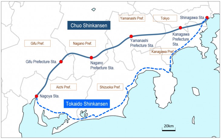 JR Central has already announced the route for the Chuo Shinkansen line and its stations as well as the location of the rail yard. The shortest radius of the curve of the guideways is 8,000 meters, which is dramatically less rounded than that for the 2,500 meters for the Tokaido Shinkansen. This serves to ease the centrifugal force that can be felt on a train when it is cruising at 500 km/h.