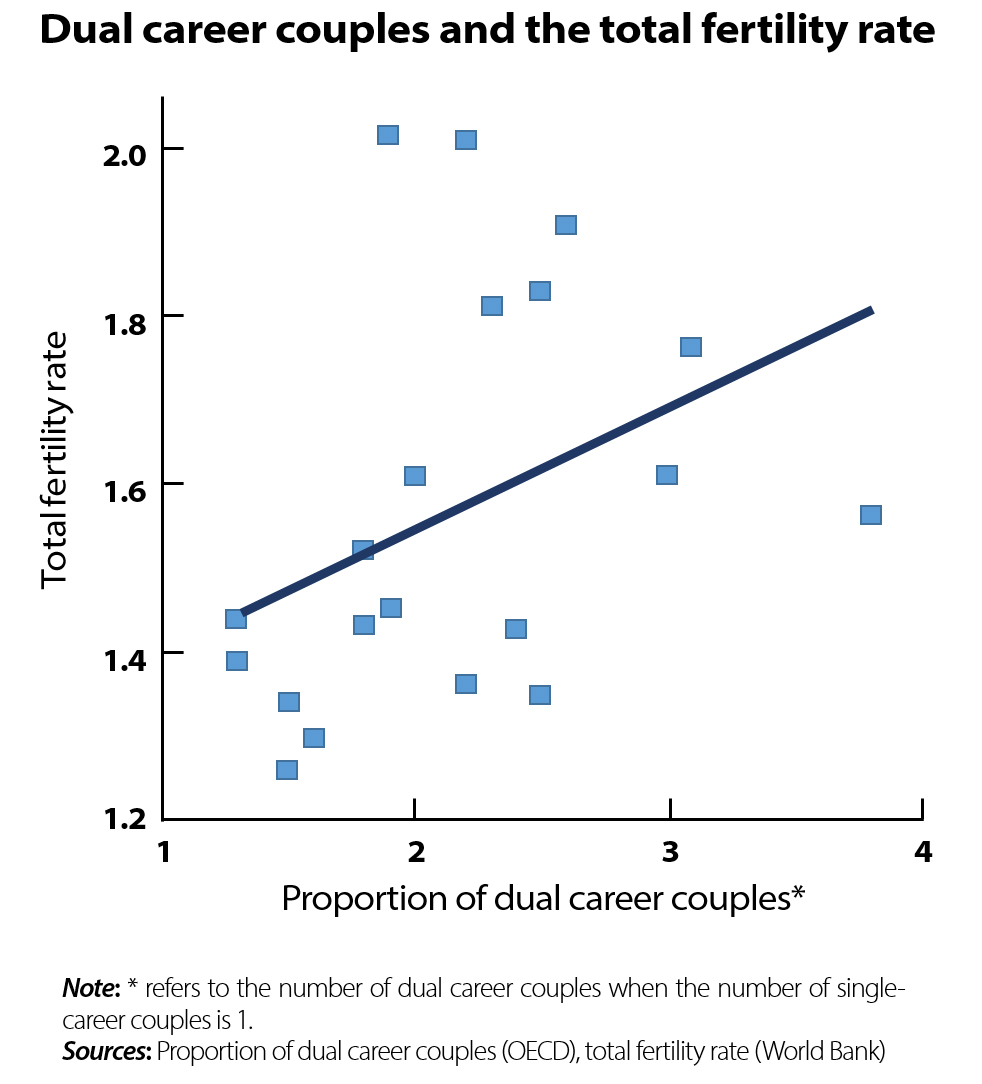 In all the countries that have brought the falling birthrate under control, it is possible for women to stay in employment and the wage gap between men and women is small. These countries have been able to draw out the positive effects of women’s earning capacity, which in the past was perceived as a negative for household formation, by reducing the difficulties around staying in employment that accompany marriage and childbirth. The figure shows the proportion of dual-career couples and the total fertility rate for the countries where data is available. I was unable to obtain data from Japan and the United States, but on the whole the relationship is positive.