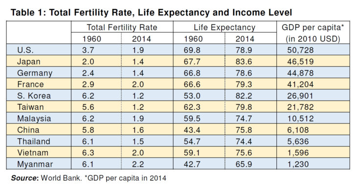 Based on trends in birthrates and average life expectancy in Asian countries such as South Korea, China, Thailand and Vietnam compared with developed countries such as the United States and Germany, the total fertility rate (number of children born to a woman during her lifetime) in 1960 was roughly more than six in those developing countries of Asia and average life expectancy at the time of birth was less than 60 years (some even below 50 years). In contrast, the birthrate in developed countries was fairly low and average life expectancy was more than 65 years.