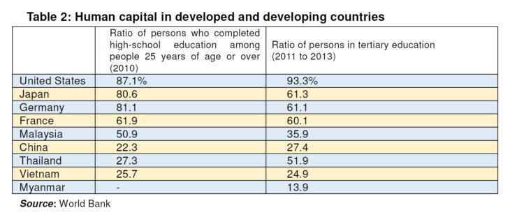 The table shows two indexes of human capital by country. The proportion of people who have completed a high-school education among people 25 years of age or over represents the current stock of human capital, and the rate of tertiary education being undertaken, for example, at universities can be interpreted as the flow of accumulation of human capital. In both cases, there is a significant gap between developed and developing countries.