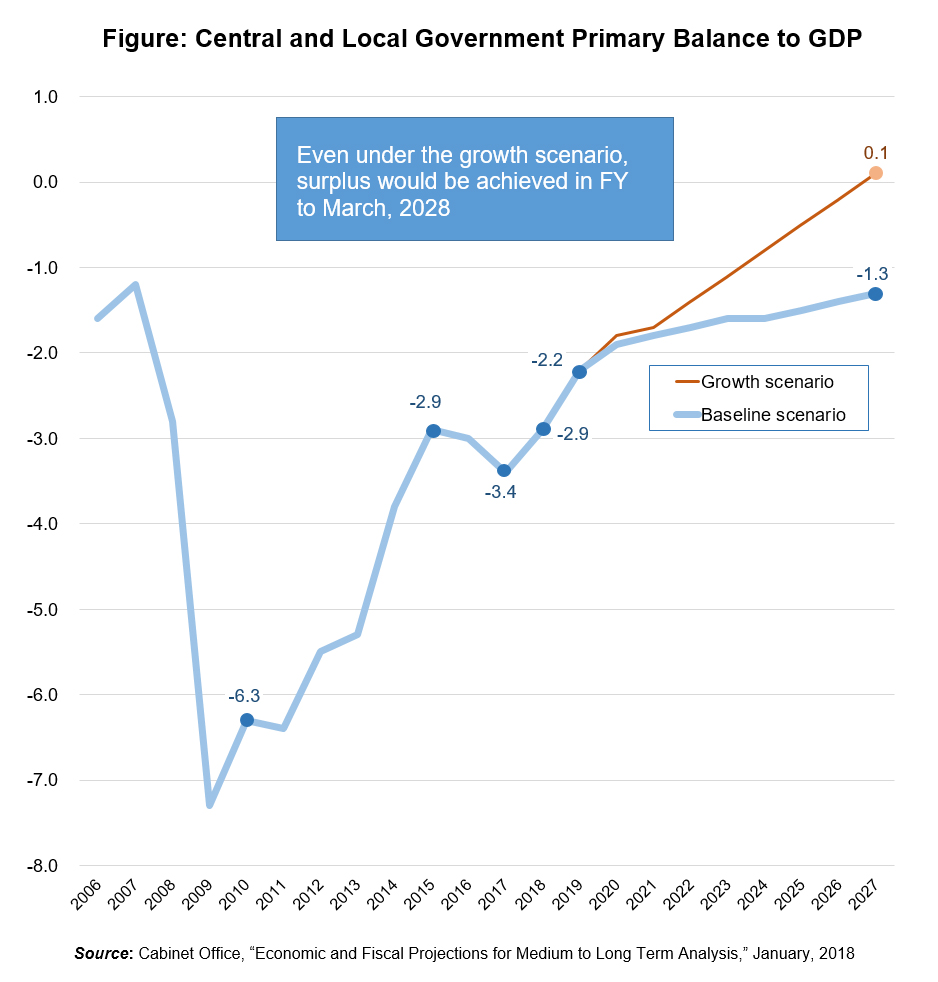 According to Cabinet Office estimates announced in January, even if the consumption tax rate is raised in October of 2019, under the government’s growth scenario, the deficit in the primary balance for the year ending March 2021 will swell from the 8.2 trillion yen estimate made in July of last year to over 10 trillion yen. Achievement of an overall surplus will also be pushed back two years to the year ending March, 2028 (see figure). According to the baseline scenario, which assumes that the economic growth rate does not recover along the lines projected by the government, the government’s fiscal status will become even more severe.
