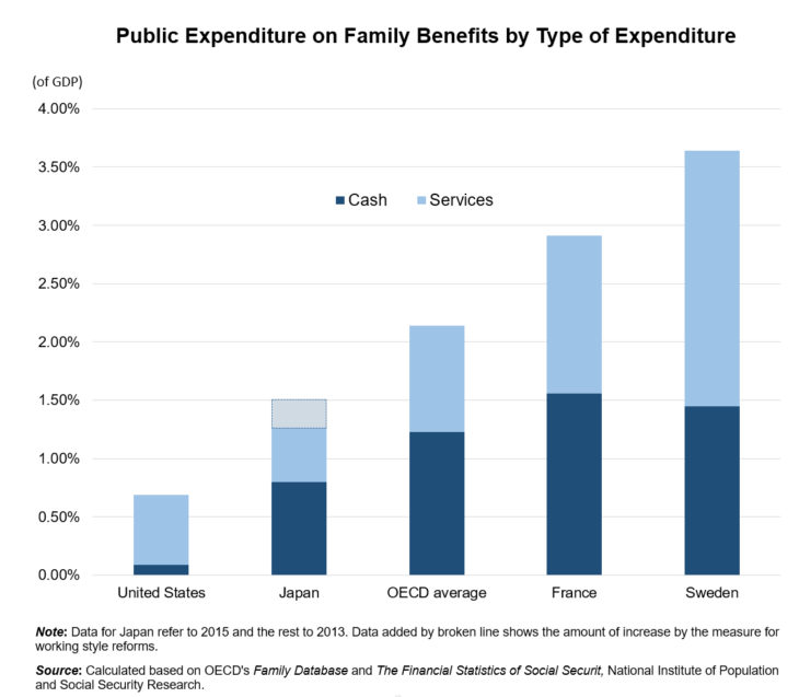 First, the policies are anticipated to product results of a certain level regarding the point that they convert social security that is biased in favor of the elderly into social security for whole generations. According to my estimates, the ratio of family-related expenditures to GDP rises from about 1.3% to 1.5% and moves a little closer to the average ratio among members of the Organization for Economic Cooperation and Development (OECD). (Refer to the figure.) The policies are in line with a policy trend in advanced countries in that they increase benefits in kind (service benefits), such as free childcare, instead of cash disbursements such as child allowances and childcare leave benefits.