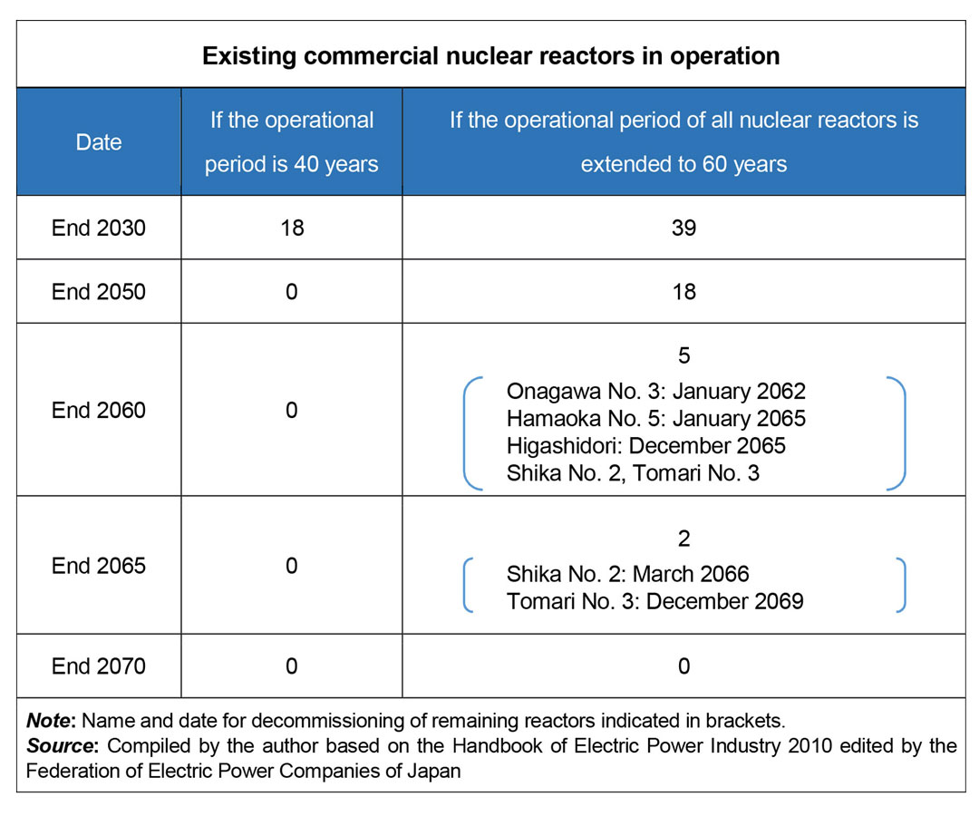 At present, there are thirty-nine nuclear reactors at the nuclear power plants in Japan (currently under construction, the Chugoku Electric Power Company’s Shimane No. 3 reactor and J-Power’s Oma nuclear power plant are omitted from the discussion as the start date of operations is unknown). As indicated in the table, there will be eighteen operational reactors by the end of 2050 even if all reactors are granted an extension to operate for sixty years.