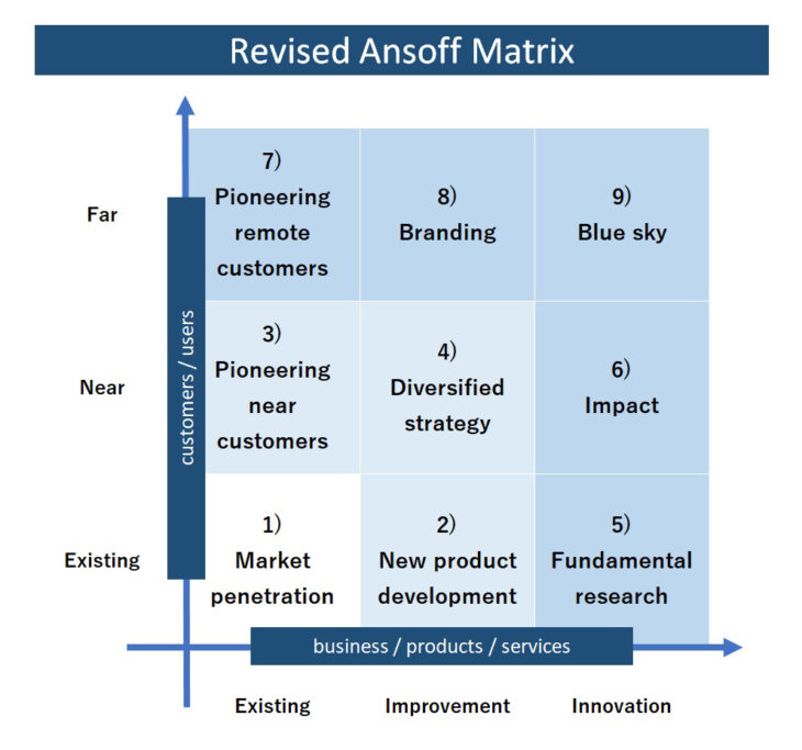 Furthermore, the real key is the fourth factor: pivoting. Please take a look at the diagram below. This is an Ansoff Matrix (a corporate strategic planning tool) to which I have made some additions. The horizontal axis shows company, products and services, and the vertical customers and users. Also, the diagram moves from existing to new from bottom left to top right.