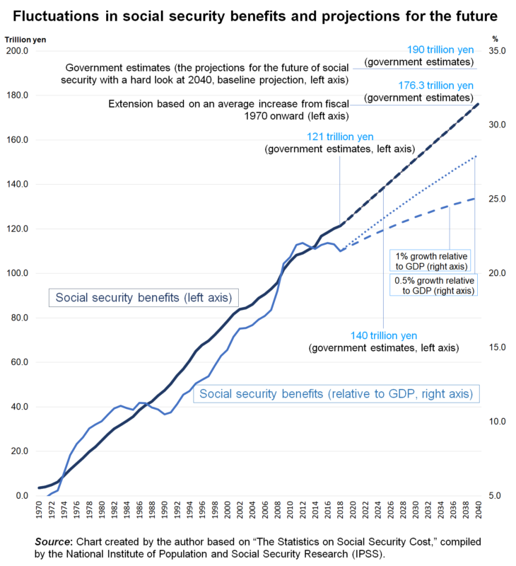 For example, according to baseline government projections, social security benefits will go from 121.3 trillion yen (21.5% relative to GDP) in fiscal 2018 to about 140 trillion yen (21.8% relative to gross domestic product, GDP) in fiscal 2025 and reach about 190 trillion yen (24% relative to GDP) in fiscal 2040.