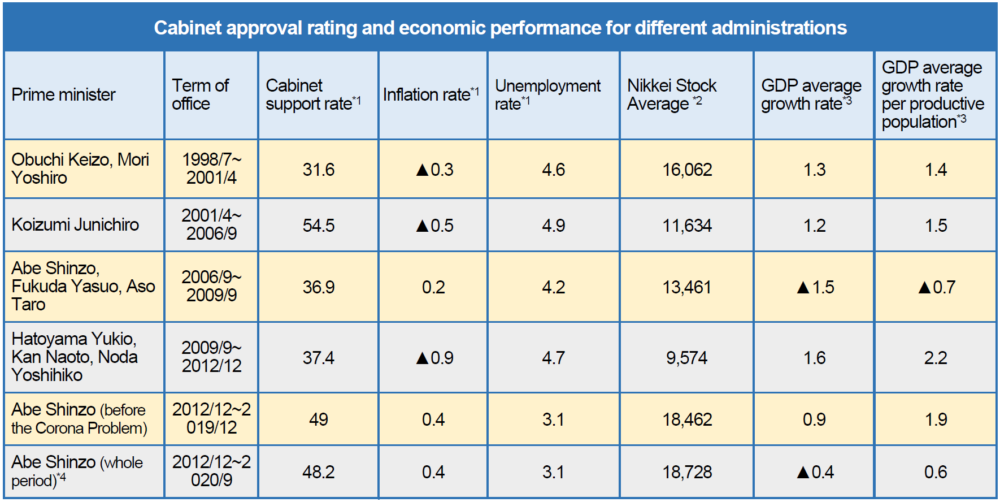 *4: The Cabinet approval rating is taken from the NHK’s “Cabinet Approval Rating Poll.” The inflation rate is in comparison with the consumer price index (CPI; all goods except fresh food and energy) of the same month one year prior. The GDP average growth rate is an annualized rate from the quarterly growth rate calculated based on an assumption of constant-rate growth from real GDP at the time of inauguration to real GDP at the time of retirement. * In addition, the GDP average growth rate is until the 2nd quarter of 2020, while the inflation rate, the unemployment rate, and the Nikkei Stock Average are until August 2020. ▲ means negative.