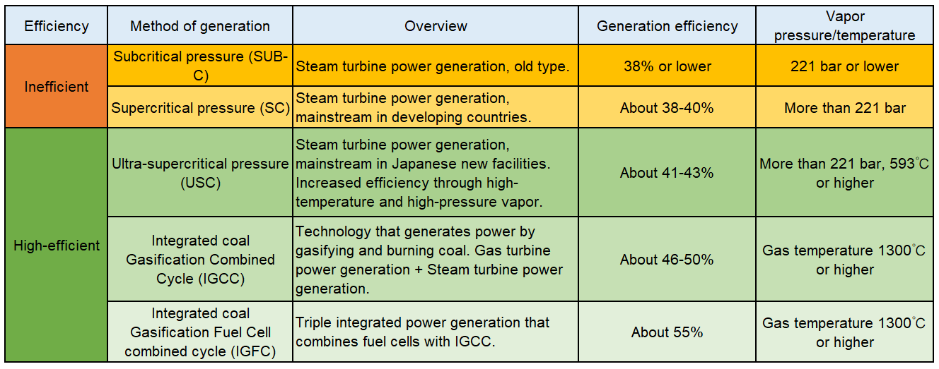 Table 2 shows different types of coal power. This table shows that Japanese coal power generation can be roughly divided into inefficient coal-fired power generation and high-efficiency coal-fired power generation according to differences in generation efficiency.