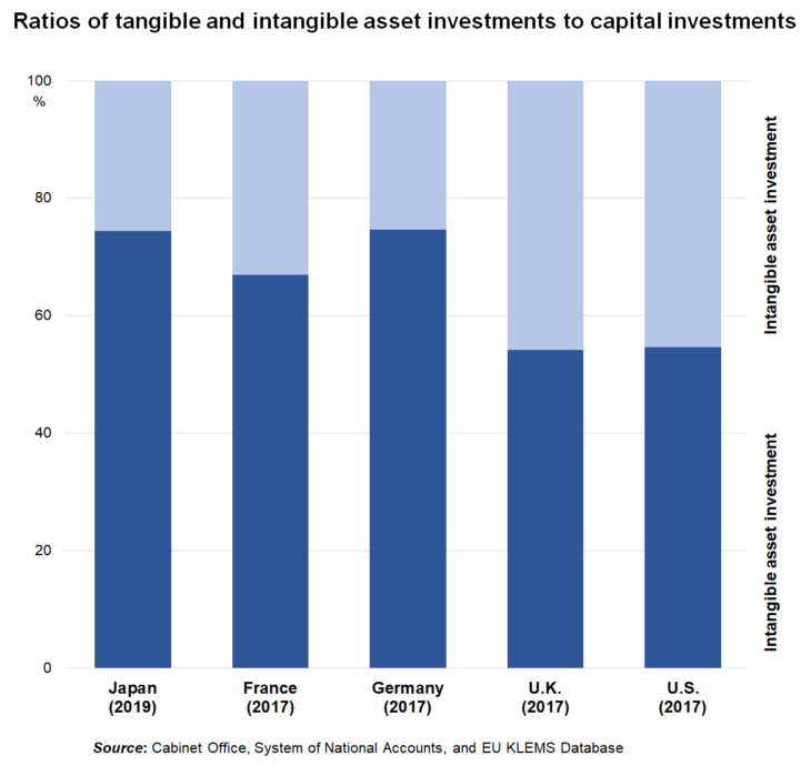 The figure below shows the ratios of tangible and intangible asset investments to overall investments excluding housing investments. The ratio of intangible asset investments in Japan is almost the same as the ratio in Germany. However, in the United States and the United Kingdom, the ratio of intangible asset investments is much higher, around 50%. Behind the difference is the fact that in Japan and Germany, the manufacturing sector, where the ratio of tangible asset investments is high, accounts for 20% of overall value added, whereas the manufacturing sector’s share of value added is 10% in the United States and the United Kingdom. If Japan is to strengthen the services sector and promote digitalization in the future, the country should promote intangible asset investment, which generates income more efficiently than tangible asset investment.