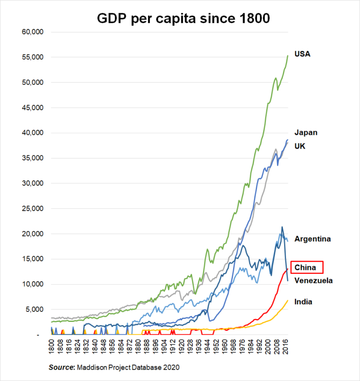 China is the world’s second largest economic power, but GDP per capita has still not reached the levels of developed countries. According to economic growth theory, if a country has the same institutional environment [as developed countries], the lower the income level of the economy, the higher the growth rate because the marginal productivity of capital is greater, bringing about relatively rapid economic growth and catch-up at a given point.