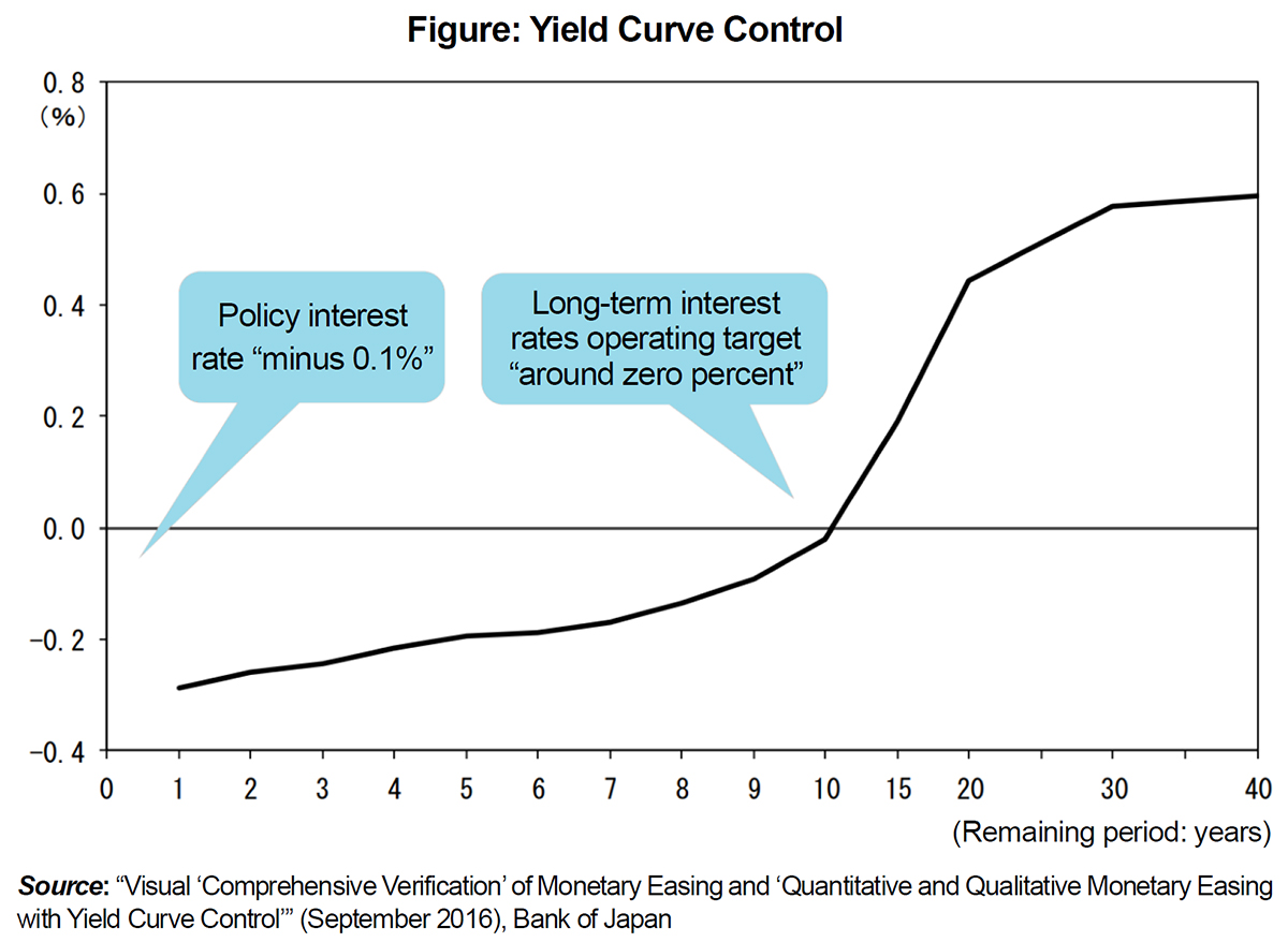 A yield curve is a graph showing interest rates on bonds for a range of maturities and is usually upward sloping. The BoJ has kept the short-term interest rate, which is the starting point of yield curve, at negative 0.1% and the yield on 10-year government bonds at around zero percent. In other words, in Japan, the yield curve showing short-term interest rates through to the 10-year Japanese Government Bond (JGB) yield has been kept almost flat at around zero. This is extremely unusual and has several side effects.