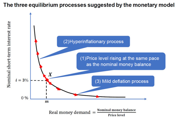 The figure shows the real money balance, which is the nominal money balance (numerator) divided by the price level (denominator), on the X-axis, and the nominal short-term interest rate on the Y-axis, while the curve descending toward the right represents real money demand. The higher (or lower) the nominal short-term interest rate, the more (less) interest income is lost by keeping money and the more money demand shrinks (expands). To simplify this discussion, let us assume that the nominal money balance increases at 2% and the real interest rate is 1% per annum. There are three equilibrium processes in this model. The first equilibrium process establishes the quantity theory of money that price level is proportional to nominal money balance. In this case, the price level rises by 2%, which is the same as the nominal money balance. The real money balance is constant at the level of m because the denominator and numerator increase at the same rate. The equilibrium level (i) of the nominal short-term interest rate is equal to 3%, which is the real interest rate of 1% plus the inflation rate of 2%. As a result, the economy stays at point X. With this equilibrium process, fiscal discipline must be maintained at all times.