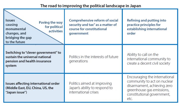 We need to improve the political landscape in Japan, as a matter of urgency. “Comprehensive reform of social security and tax” has been put forward, chiefly by the two main parties, as a serious way for the current working generation to help future generations. This should form the basis of ongoing efforts to create a better political landscape, as a matter of course for constitutional government. It should also be used as a means of countering anticipated threats for the future, through the establishment of fiscal discipline.