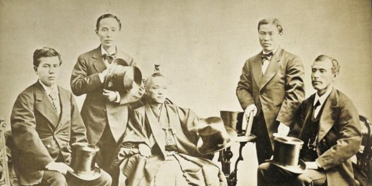 Leaders of the Iwakura Mission in London,1872. From left, Kido Takayoshi, Yamaguchi Masuka, Iwakura Tomomi, Ito Hirobumi and Okubo Toshimichi, PUBLIC DOMAIN