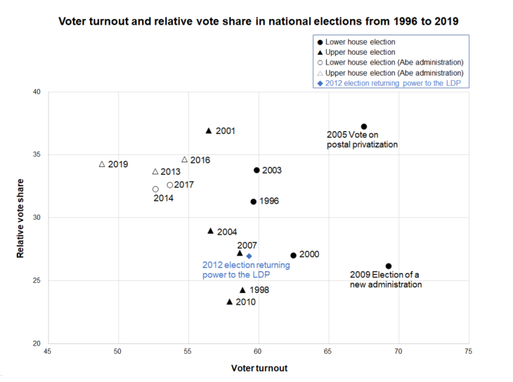 The above figure plots voter turnout and the LDP’s relative share of the proportional representation vote in national elections from 1996 onward. Relative vote share is calculated using the number of people who actually voted as the denominator. The figure reveals that a low turnout benefits the LDP. The only exception where the LDP won big despite a high turnout was the so-called postal privatization election in 2005. That anomaly aside, it can be estimated that for every 1 percent drop in turnout, the LDP’s relative vote share rose by approximately 0.5 points. Particularly noteworthy is the tendency that recent elections are all clustered in the upper left corner of the chart. This suggests evidently that the Abe ikkyo phenomenon was supported by a low voter turnout.