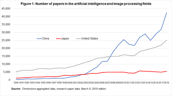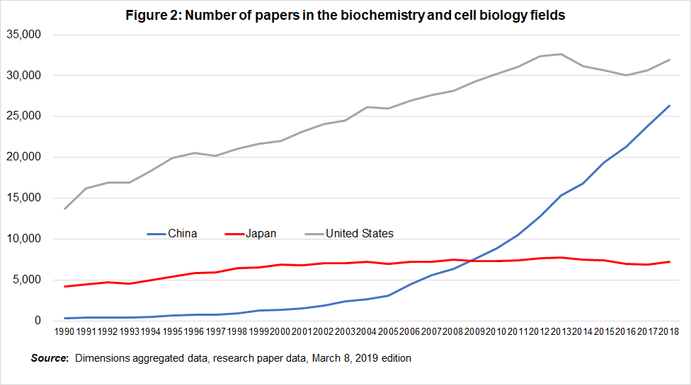 There isn’t space here to discuss these international comparisons in detail. But we can take the AI field and the biochemistry fields as two examples, and I’d like to give some comparative data on the number of papers from the United States, China and Japan.