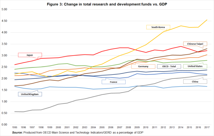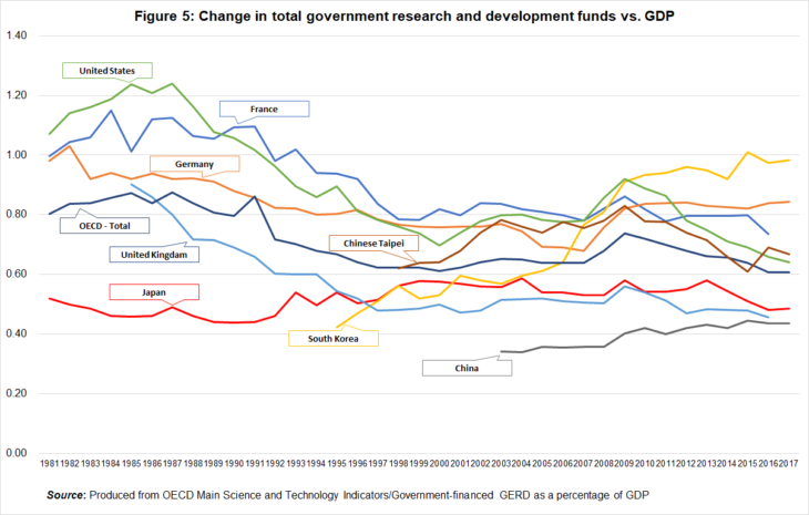 To put this another way, our nation’s research and development investment is still small. If we compare our investment to GDP ratio to other OECD countries (excluding private investment which makes up over 70% of Japan’s total research and development) that figure in 2017 was small at 0.48%. (Although, if we look at per capita research funds, we are mid-placed.) Additionally, if we compare investment in basic research against the countries of Europe and North America, it is clear that it is less in Japan (figures 3 to 5).