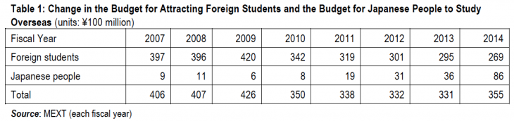 On the other hand, the budget for Japanese students to study abroad has been showing growth since FY2011. This is a response to the setting of numerical targets, such as that set out in the New Growth Strategy (June 2010 cabinet decision), to increase the number of Japanese students engaged in exchanges such as overseas study or training etc. to 300,000 people, or that set in the mid-term review by the Committee for the Promotion of Global Human Resource Development in 2011, to increase the number of Japanese people with one year or more of experience studying overseas to 80,000. Incidentally, one element contained in the definition of “global human resources” laid out by the mid-term review was “identity as a Japanese person,” from which it can be seen that the existence of foreign students is not in their field of view.