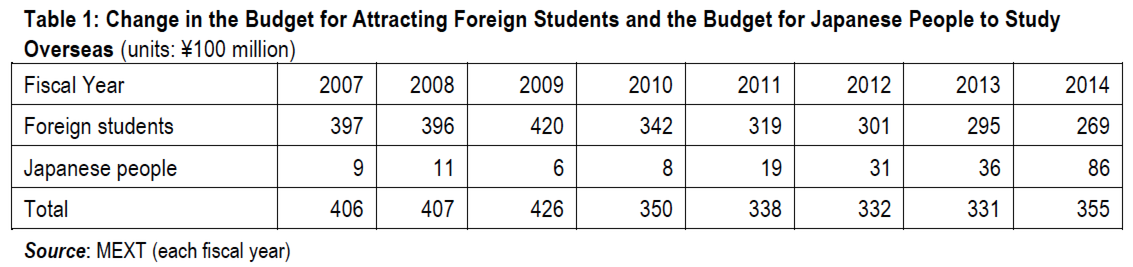 In response to this, MEXT turned their rudder towards the direction of policies for encouraging Japanese people to study abroad and developing Japanese students into global human resources. Where this is expressed most prominently is in the annual budget. Table 1 shows the budget (or proposed budget) with regard to international student exchange each year since FY2007, when they began to distinguish between the budget for attracting foreign students and that for sending Japanese students overseas. The 300,000 Foreign Students Plan established in 2008 is reflected in the sharp increase in the budget for FY2009, but prior to that too just under ¥40 billion was budgeted