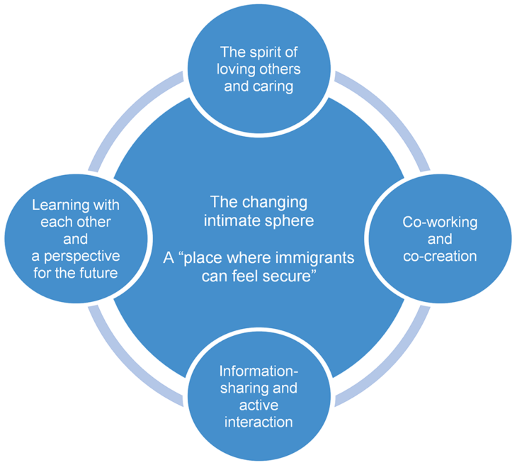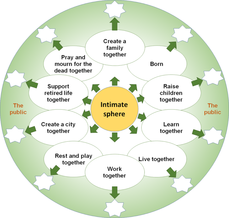 Illustration 1: A life cycle perspective, encompassing the expansion of the intimate sphere and connections with the public sphere (“The expansion of the intimate sphere seen in ‘places where immigrants feel secure’ and its connections with the public sphere” [Kawamura 2015])