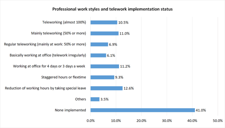 You can also see changes in awareness for these types of workers in the online survey. When asked whether they wanted to put more emphasis on their work or personal life, 50% of respondents answered, “personal life,” with 55.9% of men raising children responding that their awareness had changed in relation to dealing with housework and child raising, as time spent at home has increased for both children and parents due to COVID-19. Of the 34.5% of people who had experienced teleworking due to COVID-19, 64.2% responded that their awareness evolved towards an emphasis on their personal lives. Additionally, 24.6% said they had greater interest in moving to rural areas, with 46.3% responding that they desired a change of vocation or a side job. Off-peak commuting and telework, which had not advanced despite the government working to promote it, took off due to COVID-19, and awareness has clearly evolved. For example, we can perhaps see the potential for change in the long-standing issues in Japan of a heavy concentration of people in Tokyo and depopulation in rural areas, as well as a stagnant labor market.