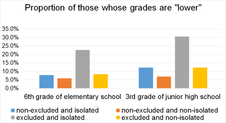 The proportion of people who responded “My grades dropped” to the question about their school performance is conspicuously high in the excluded and isolated layer. Moreover, the proportion of those who said their grades went down increased from 22.6% in elementary school to 30.6% in junior high school. In short, it became difficult for the students to adapt to the class work as they advanced through the grades.