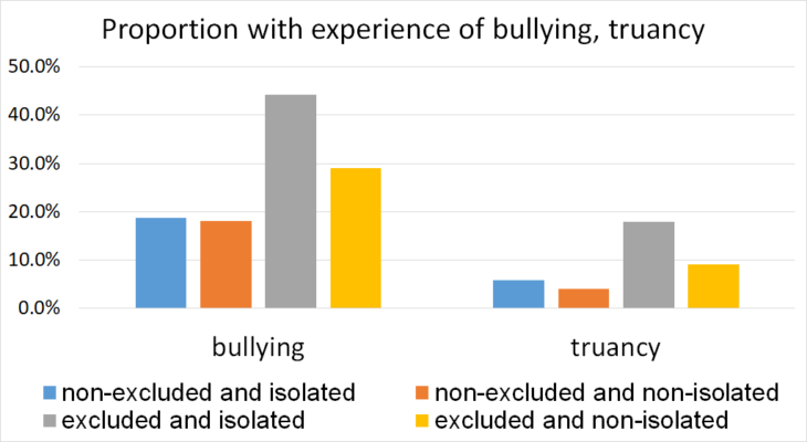 Many people had also experienced bullying and truancy. In particular, 44.3% of respondents had had experience of bullying. Whereas the truancy experience is at the most 9% among the other layers, it is as high as 18% in the excluded and isolated layer. Understandably, this is the reason why the excluded and isolated layer leave school with a comparatively poor academic record (numerical value omitted).
