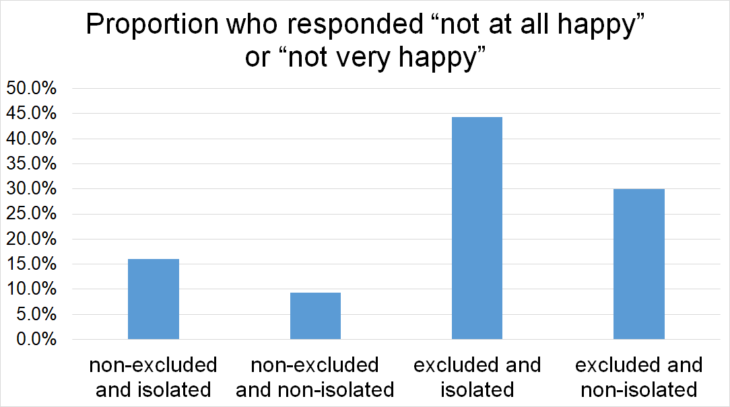 As many as 44.3% of people in the excluded and isolated layer responded that they are “not at all happy” or “not very happy.” In the excluded and non-isolated layer, the figure was 30%. In the non-excluded layers, the figure declined even further to 16% for the non-excluded and isolated layer, and 9.3% for the non-excluded and non-isolated layer.