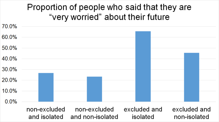 In addition to economic insecurity, the people in the excluded and isolated layer are neither happy nor do they have friends or acquaintances to rely on. In such a situation, it is unreasonable to tell them not to worry about the future. If we include the people who said that they are “fairly worried” about their future, 86.7% of people in the excluded and isolated layer are worried about their lives in the future.