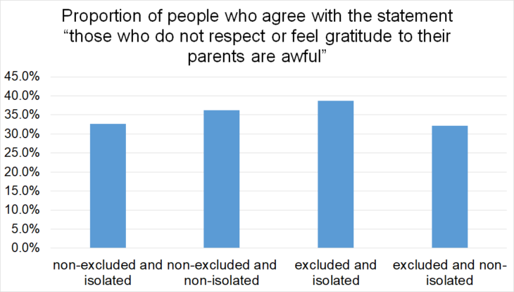 But the other two results are surprising. You may not notice it at first glance since the middle graph in Fig. 4 shows small differences between the people who answered “yes” to the question “those who do not respect or feel gratitude to their parents are awful.” Among the people who agreed with this statement, the highest number is in the excluded and isolated layer (38.7%). The difference with the other groups is about five percentage points.