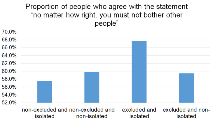 The attitude of not complaining about one’s own hardship is expressed more clearly in the answers to the statement “no matter how right, you must not bother other people.” Among people in the excluded and isolated layer, a little below 70% said that they agree with this statement. This figure is nearly ten percentage points higher than the other groups. In short, the excluded and isolated layer feel more strongly than others that they must not bother other people.