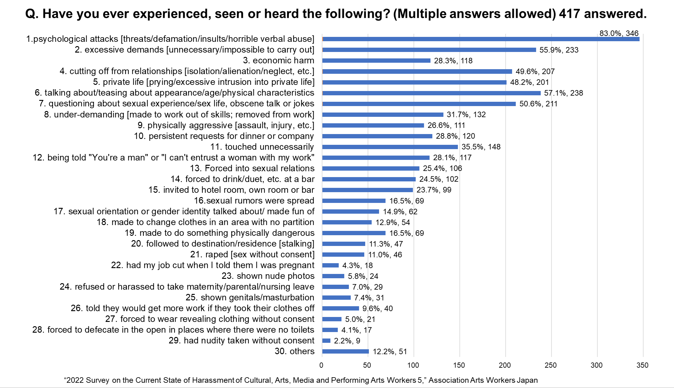 According to the 2022 survey, 93.2% of the 411 respondents had heard about, witnessed or experienced power harassment and 73.5% had heard about, witnessed or experienced sexual harassment. Detailed examples of victimization include “psychological attacks [threats/defamation/insults/horrible verbal abuse]” (83%), “told they would get more work if they took their clothes off” (9.6%), and “raped [sex without consent]” (11%), and there are many results that raise the question of whether they may be criminal (see figure: “Q. Have you ever experienced, seen or heard the following” [Survey on the Current State of Harassment of Cultural, Arts, Media and Performing Entertainment Workers]).