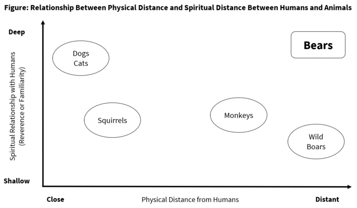 The figure (Figure: Relationship between physical distance and spiritual distance between humans and animals) relatively depicts the physical distance and spiritual relationship between humans and animals. As has been stated, bears are beings that we wish to remain as physically distant from as possible, while at the same time, the spiritual relationship with them reaches the deepest parts of the human heart. Dogs and cats are animals that are physically extremely close and maintain a deep spiritual relationship with humans. However, that relationship is directed toward affection and companionship, which is entirely different from the relationship with bears. There is no animal other than the bear that occupies such a unique position in its spiritual relationship with humans.