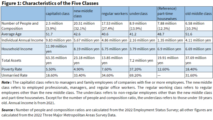 Figure 1[2] illustrates the characteristics of the five classes, which are based on data from the 2022 Survey of the Three Major Metropolitan Areas. However, the numbers and composition ratios are taken from the government’s Employment Status Survey. Most part-time housewives are married female non-regular workers who rely heavily on their husbands, who belong to the new middle class or regular working class, for their livelihoods. Therefore, this stratum cannot be considered an independent class and is treated separately.